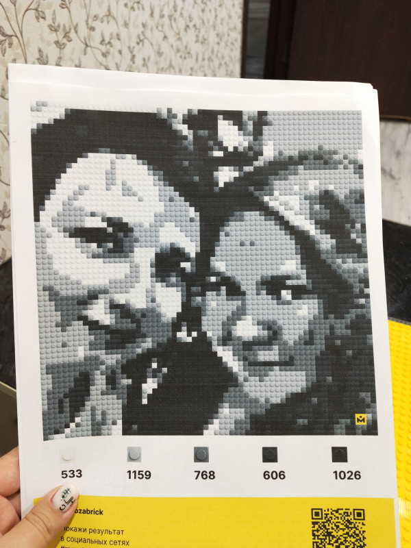 Я приятно удивлена , как программа так точно смогла сгенерировать фотографию. Я до последнего не верила, что такое можно сотворить. Мне понравилось абсолютно всё! От доставки до самого товара. Это прекрасно подойдёт для подарка))) У меня вышло 5 часов работы на 2900 шагов. Спасибо QBRIX за возможность творить самим , то что кажется нереальным