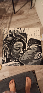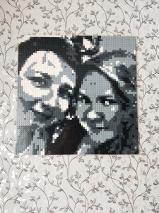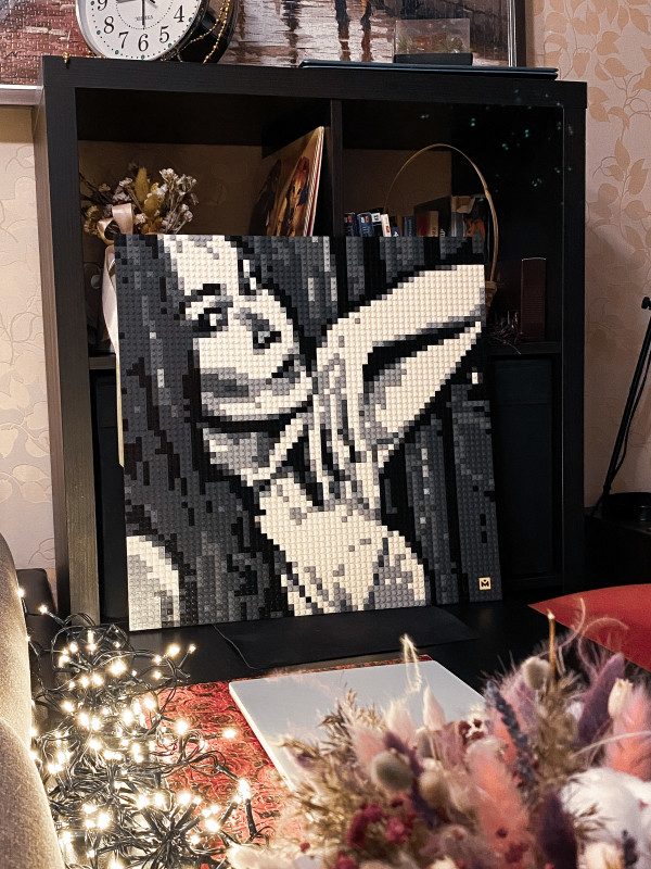 Идея хороша, нет слов! Реализация тоже вполне увлекательна. Но есть два жирных НО. Первое - мы перебрал гору фотографий, чтобы найти ту, из которой можно сделать проект. Потому что подходят только фото лица крупным планом, при этом фото на картине будет узнаваемо только издалека. Сайт предлагает несколько вариантов сборки одной фотки, но все они качества весьма так себе(( Ладно, фото нашли, опикселили на сайте, собрали, но из 4 частей собрать картину с помощью крепежа и установить её на подставку невозможно, картина слишком тяжела для подставки и крепёж не держится, картина рассыпается(( сюрприз не удался, пришлось вручать фото, лежащим на полу((