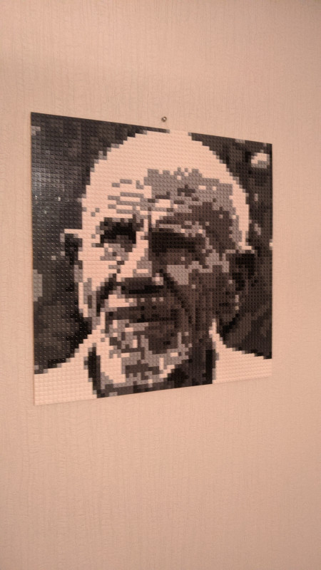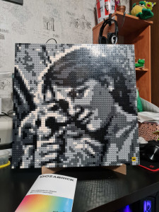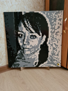 Идея хороша, нет слов! Реализация тоже вполне увлекательна. Но есть два жирных НО. Первое - мы перебрал гору фотографий, чтобы найти ту, из которой можно сделать проект. Потому что подходят только фото лица крупным планом, при этом фото на картине будет узнаваемо только издалека. Сайт предлагает несколько вариантов сборки одной фотки, но все они качества весьма так себе(( Ладно, фото нашли, опикселили на сайте, собрали, но из 4 частей собрать картину с помощью крепежа и установить её на подставку невозможно, картина слишком тяжела для подставки и крепёж не держится, картина рассыпается(( сюрприз не удался, пришлось вручать фото, лежащим на полу((