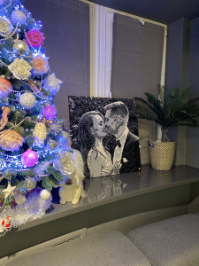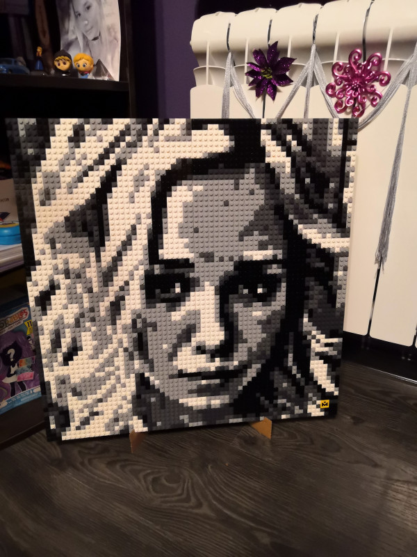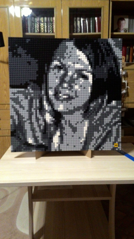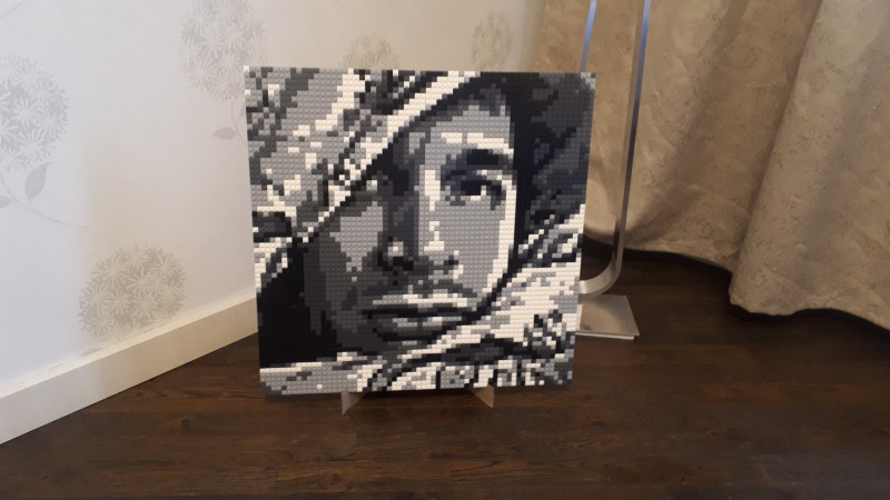 Идея хороша, нет слов! Реализация тоже вполне увлекательна. Но есть два жирных НО. Первое - мы перебрал гору фотографий, чтобы найти ту, из которой можно сделать проект. Потому что подходят только фото лица крупным планом, при этом фото на картине будет узнаваемо только издалека. Сайт предлагает несколько вариантов сборки одной фотки, но все они качества весьма так себе(( Ладно, фото нашли, опикселили на сайте, собрали, но из 4 частей собрать картину с помощью крепежа и установить её на подставку невозможно, картина слишком тяжела для подставки и крепёж не держится, картина рассыпается(( сюрприз не удался, пришлось вручать фото, лежащим на полу((