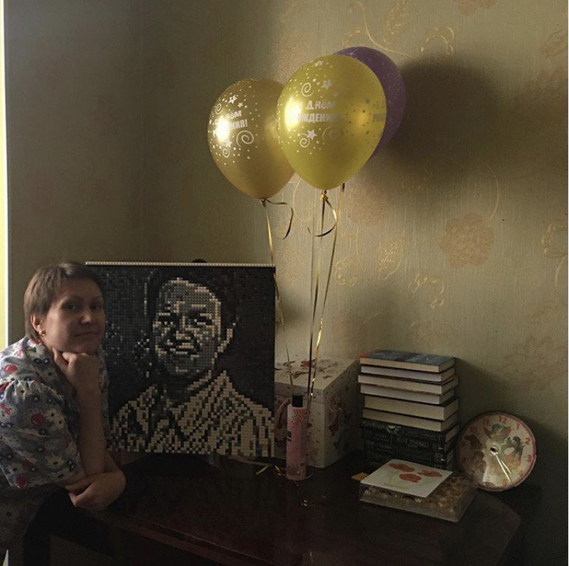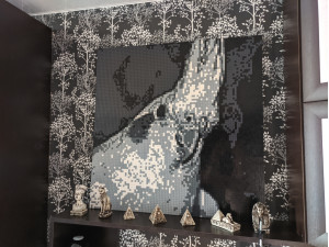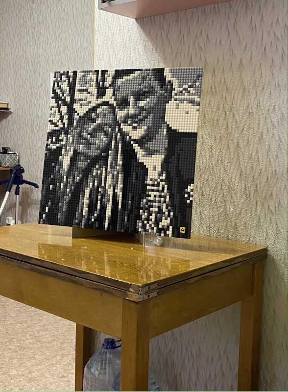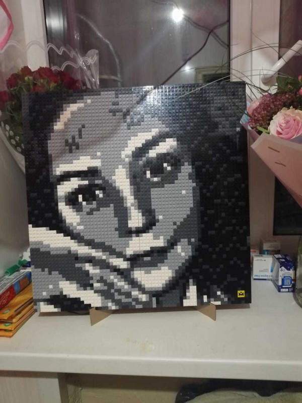 Идея хороша, нет слов! Реализация тоже вполне увлекательна. Но есть два жирных НО. Первое - мы перебрал гору фотографий, чтобы найти ту, из которой можно сделать проект. Потому что подходят только фото лица крупным планом, при этом фото на картине будет узнаваемо только издалека. Сайт предлагает несколько вариантов сборки одной фотки, но все они качества весьма так себе(( Ладно, фото нашли, опикселили на сайте, собрали, но из 4 частей собрать картину с помощью крепежа и установить её на подставку невозможно, картина слишком тяжела для подставки и крепёж не держится, картина рассыпается(( сюрприз не удался, пришлось вручать фото, лежащим на полу((